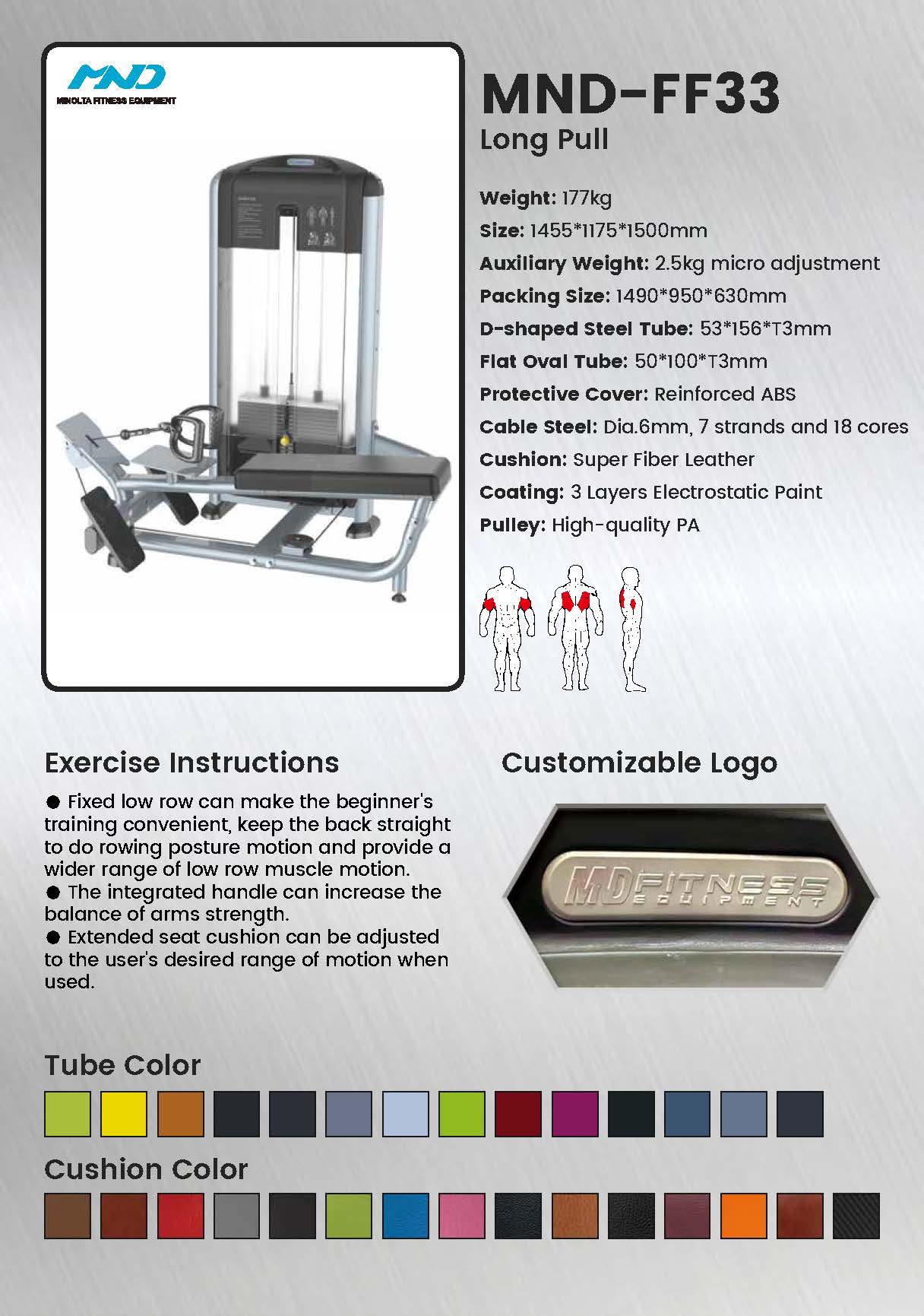 Target the entire back matrix. The FF33 emphasizes the mid-back, lats, and rhomboids through a horizontal pulling motion, essential for building back thickness, improving posture, and balancing upper body development.