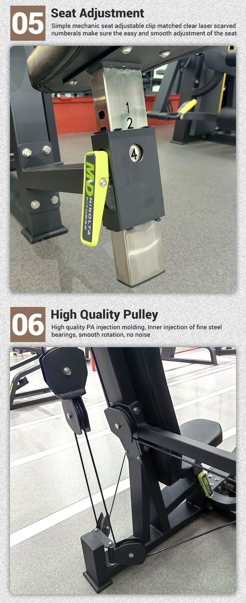 Engineered with high-quality bearings and durable upholstery, the MND-F86/B delivers a smooth, quiet, and comfortable training experience. Its 230KG solid steel frame guarantees stability during explosive movements.